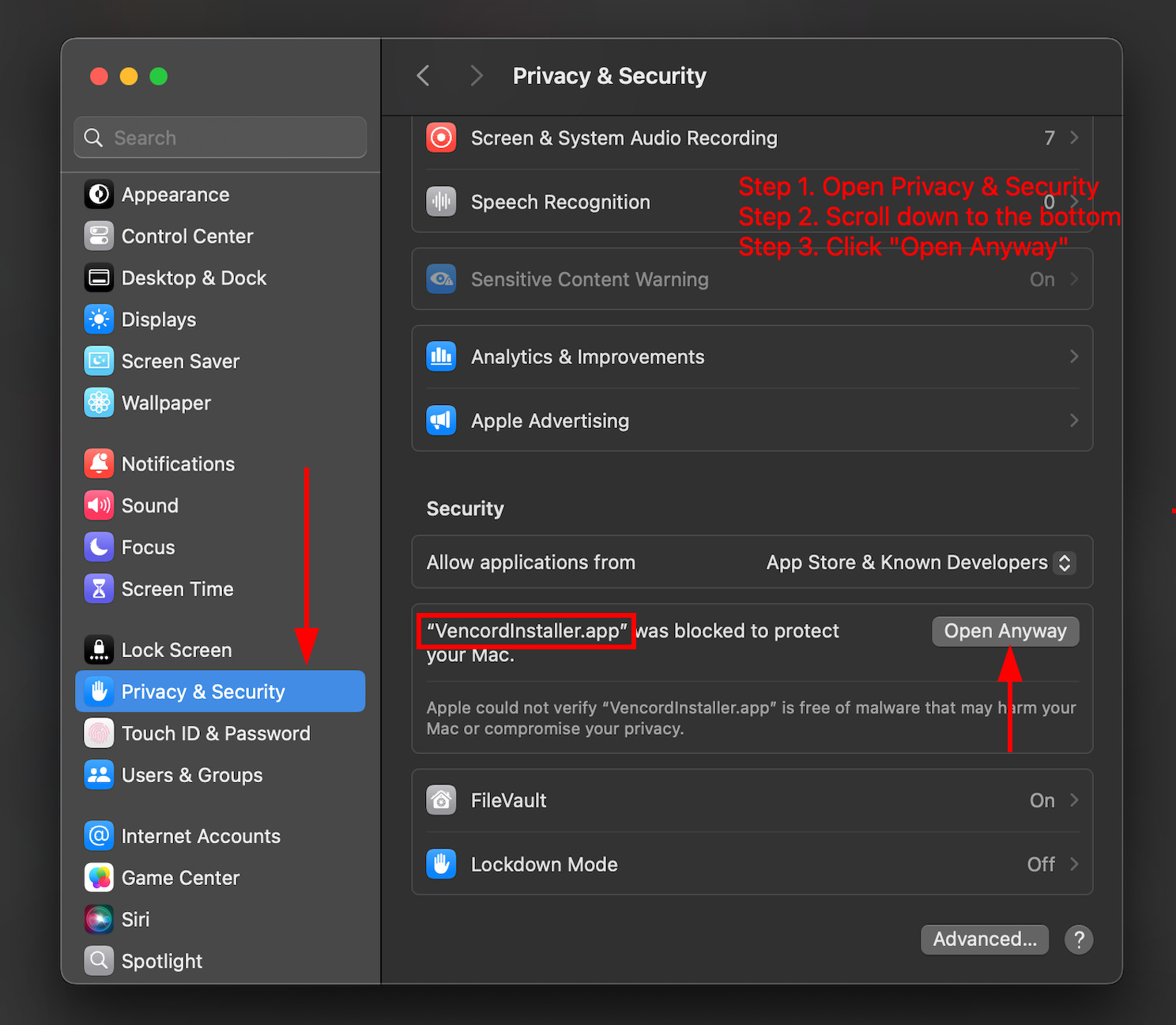 If you get a VencordInstaller can't be opened warning, right-click VencordInstaller.app and click open (macOS Sonoma and earlier)